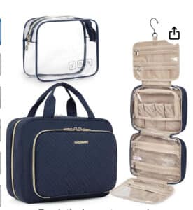 bagsmart toiletries hanging bag.This spacious bag is TSA carry on allowable. The hook makes it easy to hang and access in any hotel bathroom.